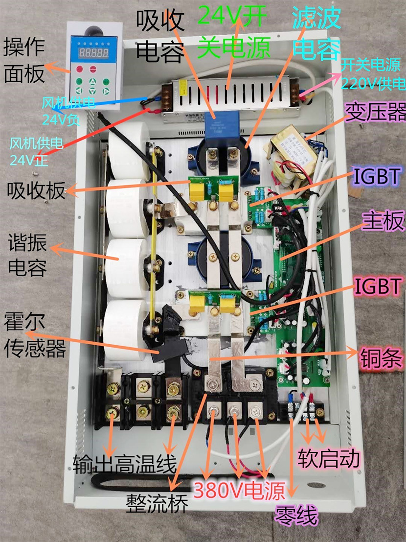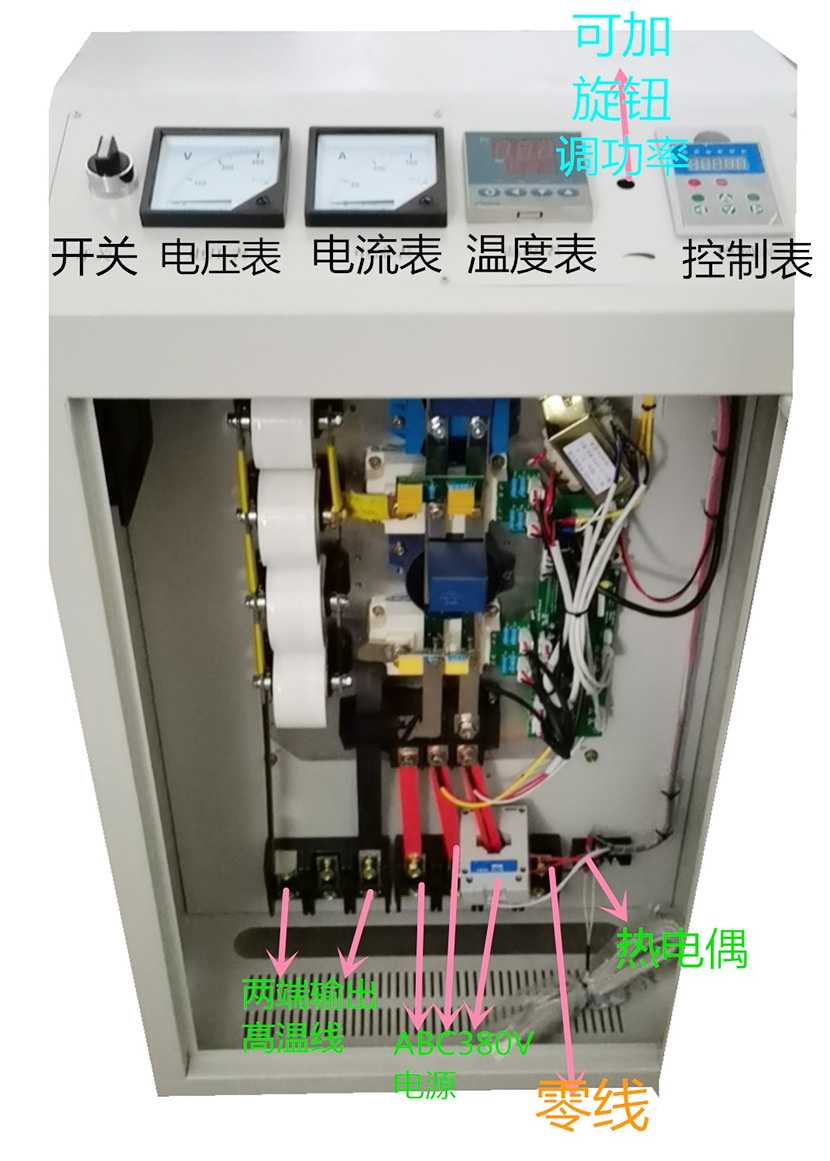 步骤四:将绕在料筒上电磁加热线圈的两个端子与电磁加热器输出端的L1、L2或者是用OUT1,OUT2标志。连接,U、V、W或者R,S,T标志。接三相380V电源,N接零线,没有不接。软开关线、电源线和电磁圈线不可互串或与外壳有任何连接