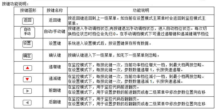 L0.0x/LH.0x 1.显示"L0.0x"表示设备工作在自控模式,此时设备自动 检测控制信号及控制功率。 2.显示"LH.0x"表示设备工作在手控模式,此时设备只能 通过"递增键"或"递减键"控制功率。 3.按"自动/手动键"可以切换手控和自控两种调功模式。4. 在此模式下按确认键可进入下一级菜单显示当前目标功 率百分比,按"返回键"则返回上一层菜单。   功率档位